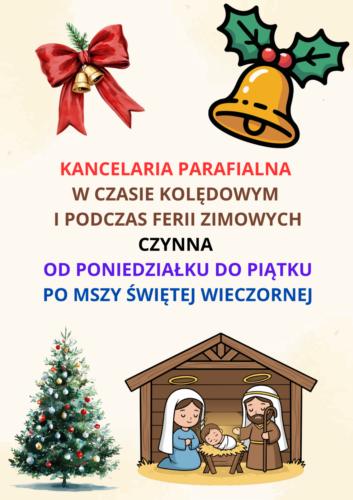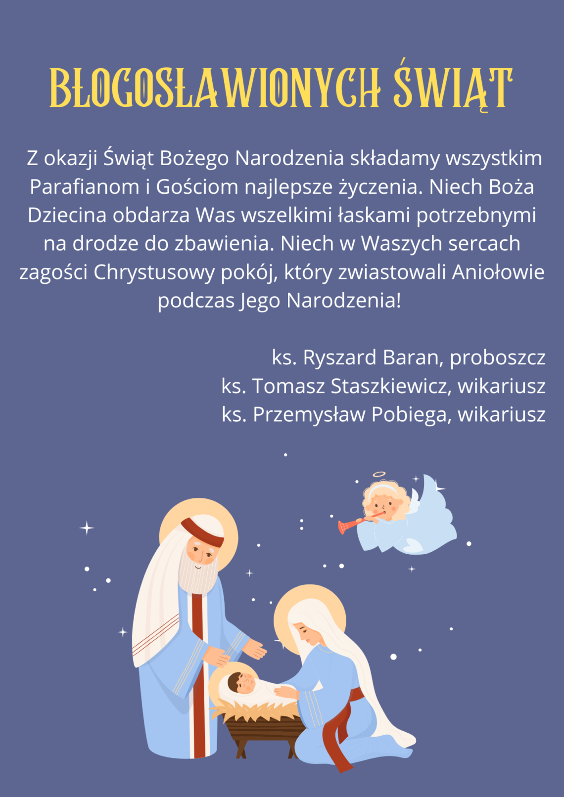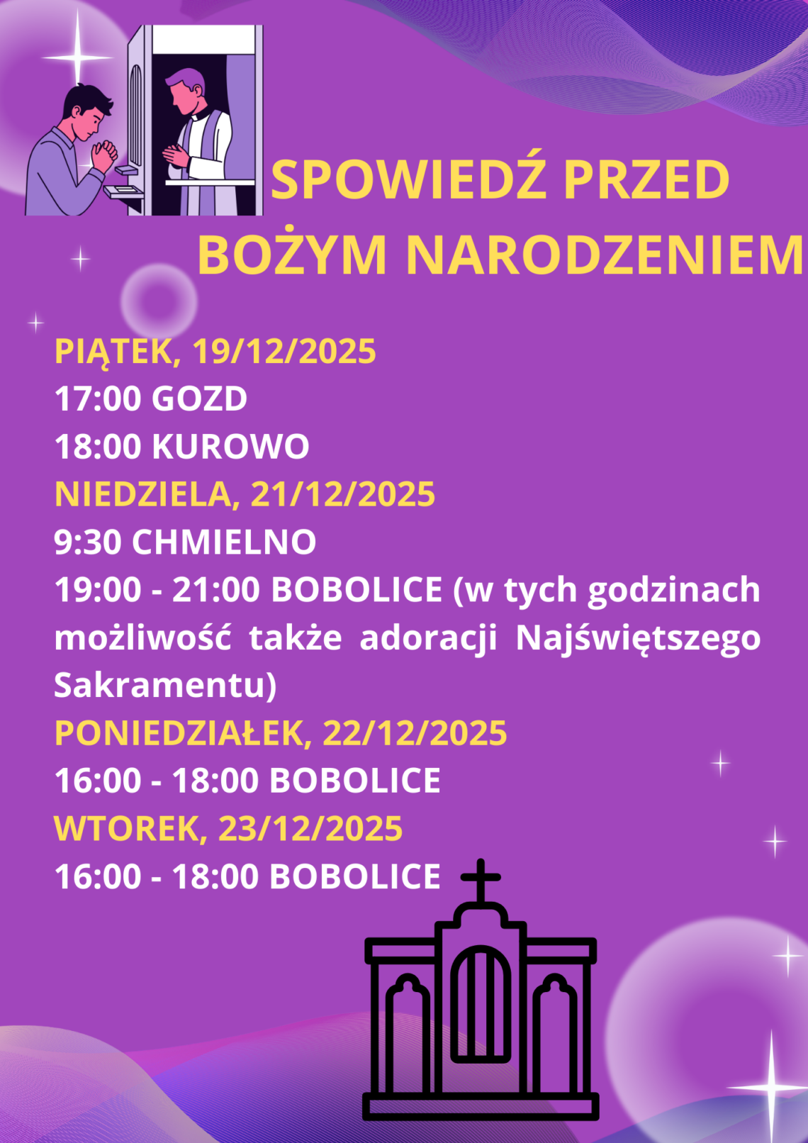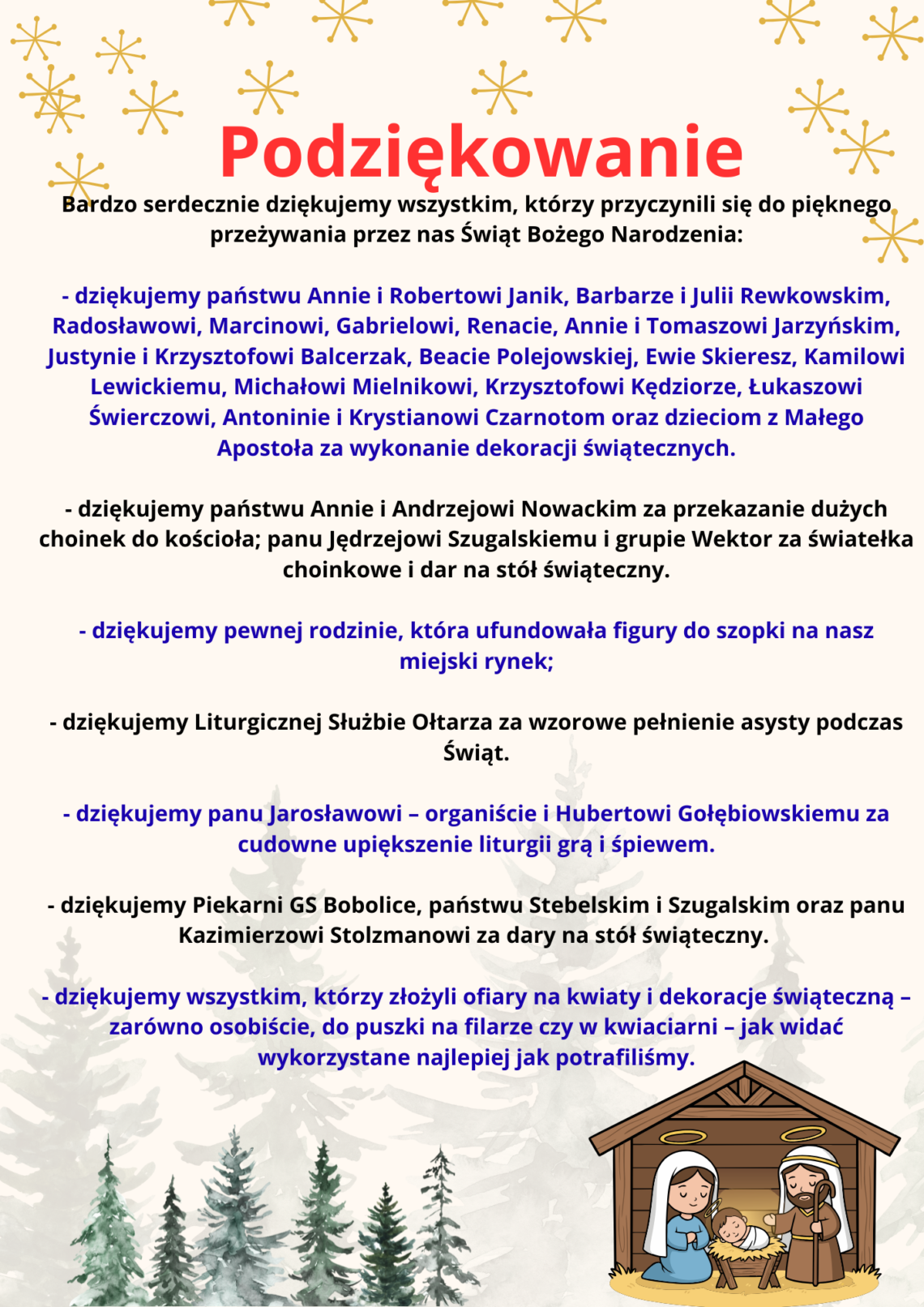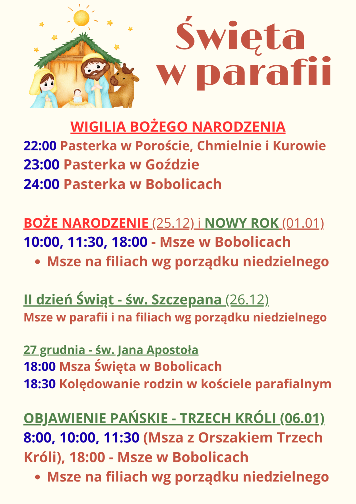 Ks. TOMASZ Ks. PRZEMEK 27.12.2025 g. 10:00 Lubino Łozice Koszalińskie Kije Janowiec Chlebowo Opatówek Ostrówek Bolechowice Błotko Łozice Cegielnia Stare Łozice 29.12.2025 g. 16:00 Piaszczyte Jatynia Jatynka Dzięciołowo Nowosiółki Dworzysko Nowe Łozice 30.12.2025 g. 16:00 Chmielno od g. 14:00 Więcemierz Pomarzany Radwanki 02.01.2026 g. 16:00 Porost – Kolonia Boboliczki 03.01.2026 g. 10:00 Gozd Ujazd 05.01.2026 g. 16:00 ul. Fabryczna 1-14 ul. Spacerowa ul. Ogrodowa ul. Łąkowa 07.01.2026 g. 16:00 ul. Fabryczna 15 – 26 ul. Wiejska ul. Sienkiewicza 08.01.2026 g. 16:00 ul. Mickiewicza ul. Warszawska ul. Magazynowa 1-2 09.01.2026 g. 16:00 ul. Tylna ul. Reja ul. Magazynowa 3 10.01.2026 g. 10:00 ul. Koszalińska ul. Szpitalna ul. Górskiego ul. Podgórna Chociwle (rozpoczęcie od Kolonii – od ul. Fabrycznej, potem Kolonia, następnie prawa strona od Bobolic, Buszynko, powrót w stronę Bobolic) 12.01.2026 g. 16:00 ul. Wojska…
